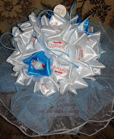 Bukiecik wykonałam na prezent z okazji komunii. Białe praliny łatwo można wykorzystać jako bazę do stworzenia takiego prezentu :)